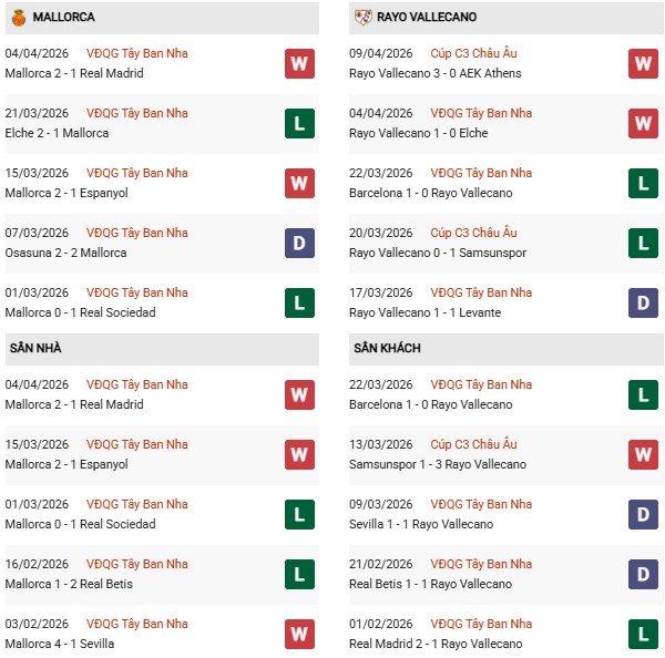 - Trên sân nhà, Mallorca thắng 7, thua 1 trước Vallecano.