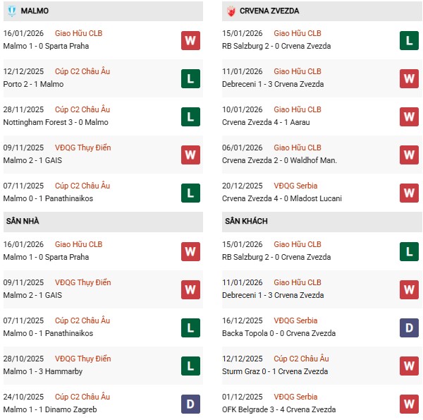 Thống kê phong độ Malmo vs Crvena Zvezda: