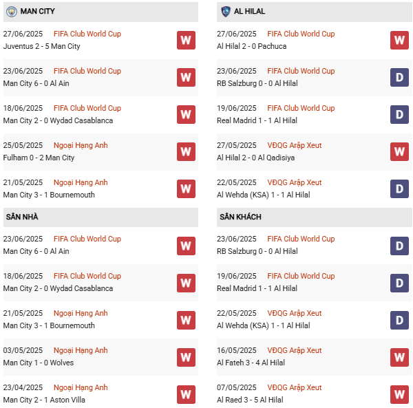 Thống kê phong độ Man City vs Al Hilal:
