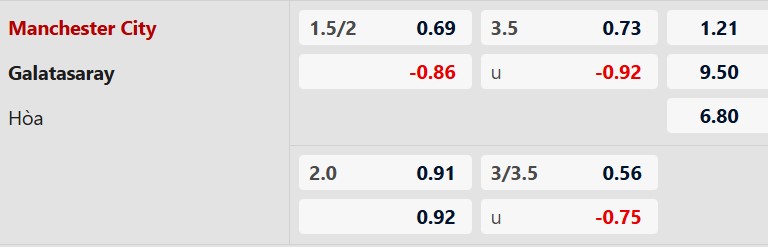 Thông tin tỷ lệ kèo bóng đá Man City vs Galatasaray: