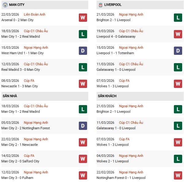 Thống kê phong độ Man City vs Liverpool:
