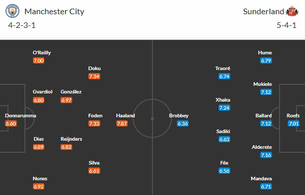 Nhìn chung, Man City ở thời điểm hiện tại rất mạnh. Họ đặc biệt đáng sợ trong tấn công với “mũi đinh ba” gồm Jeremy Doku, Phil Foden và Erling Haaland đều đang đạt phong độ rất cao, trong đó Haaland đang dẫn đầu danh sách “Vua phá lưới” ở Premier League với 15 bàn thắng. Thế nên, khả năng Man City xé lưới của Sunderland để giành 3 điểm là rất cao.