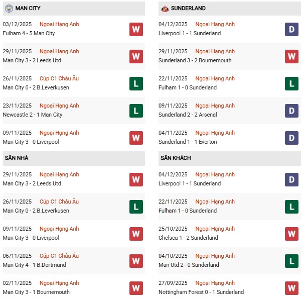 Thống kê phong độ Man City vs Sunderland: