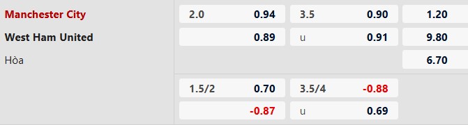 Thông tin tỷ lệ kèo bóng đá Man City vs West Ham:
