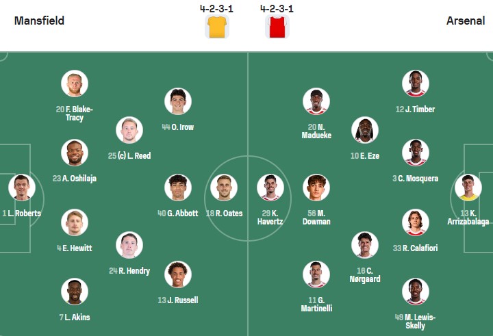 Đội hình dự kiến Mansfield Town vs Arsenal: