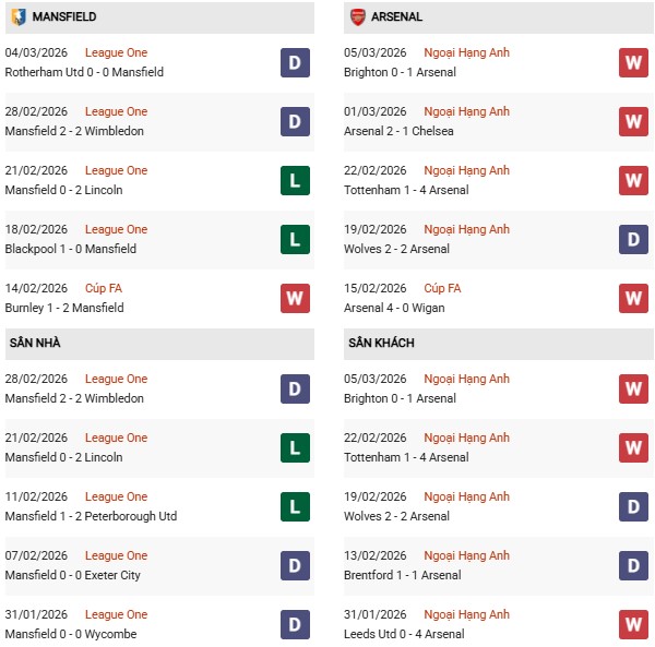 Thống kê phong độ Mansfield Town vs Arsenal: