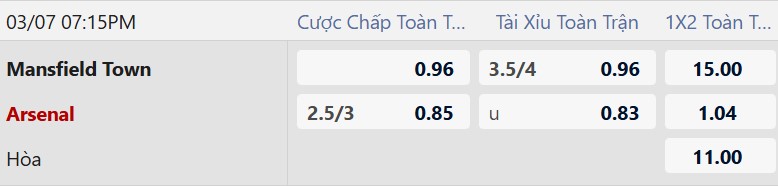 Thông tin tỷ lệ kèo bóng đá Mansfield Town vs Arsenal: