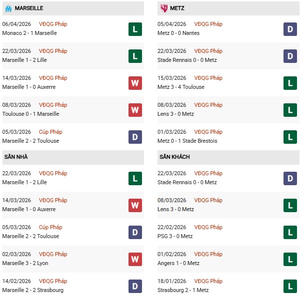 - Trên sân nhà, Marseille thắng 6, hòa 4 trước Metz.