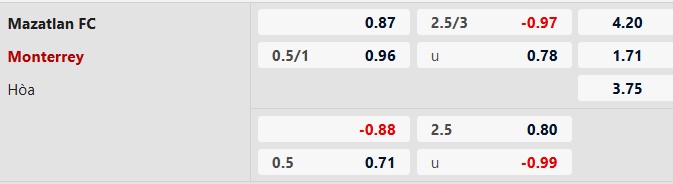 Thông tin tỷ lệ kèo Mazatlan vs Monterrey:
