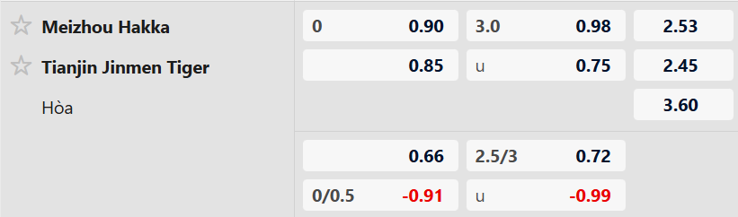 Thông tin tỷ lệ kèo Meizhou Hakka vs Tianjin Jinmen Tiger: