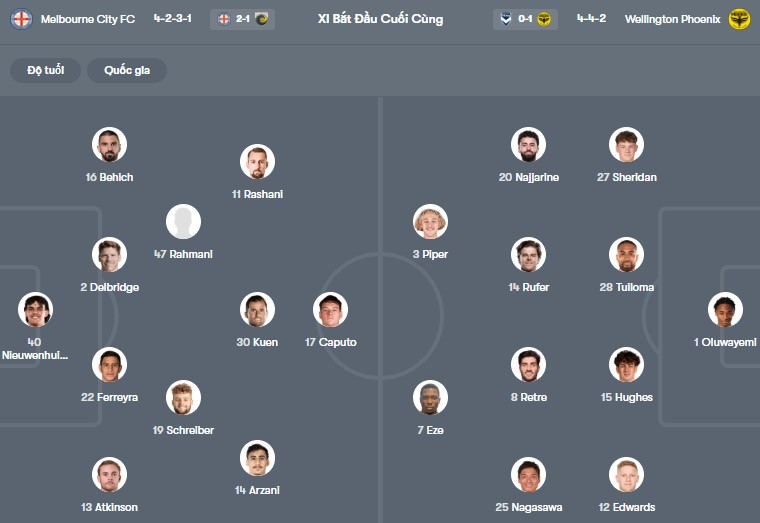 Ở phía đối diện, Wellington Phoenix đang xếp thứ 8 với 30 điểm và chỉ kém chính Melbourne City 2 điểm. Đội bóng của HLV Chris Greenacre đang có phong độ rất ấn tượng. Họ đã toàn thắng 3 vòng gần nhất, bao gồm chiến thắng 1-0 trước Melbourne Victory và 2-1 trước Brisbane Roar. Đây là giai đoạn mà Wellington thể hiện sự lì lợm và hiệu quả cao, đặc biệt trong các tình huống phản công.