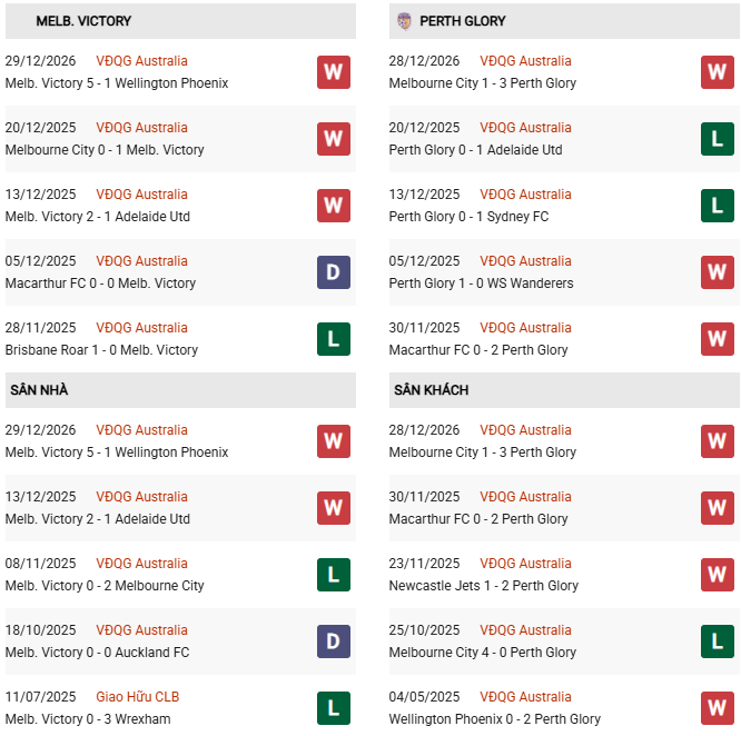 - Trên sân nhà, Melbourne Victory thắng 7, thua 2 trước Perth Glory.