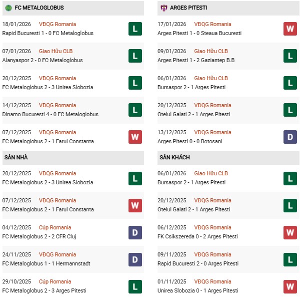 - Metaloglobus thắng 2, hòa 3, thua 5 trong 10 trận gặp Arges Pitesti gần đây.