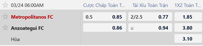 Thông tin tỷ lệ bóng đá Metropolitanos vs Anzoategui FC: