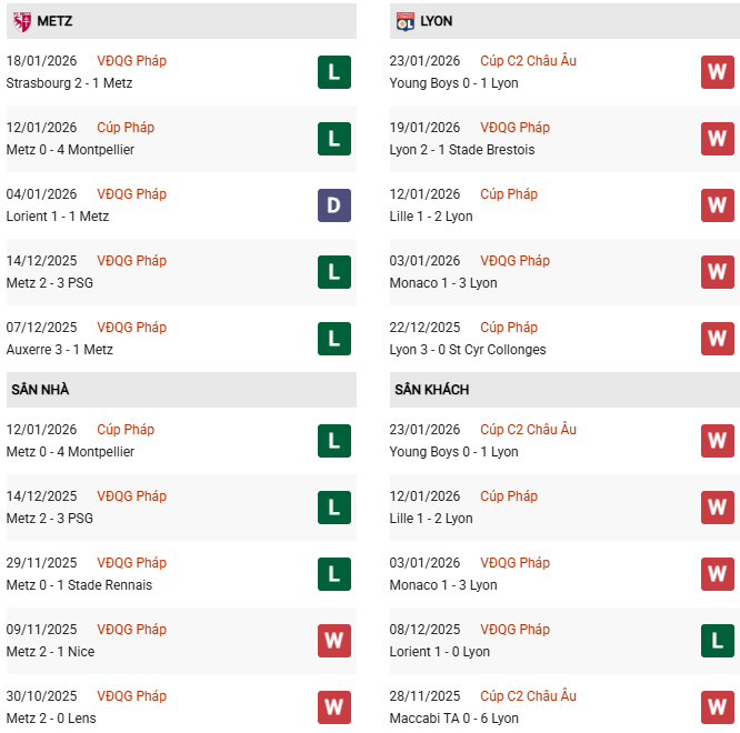 - Metz thắng 2, hòa 2, thua 6 trong 10 trận gặp Lyon gần đây.