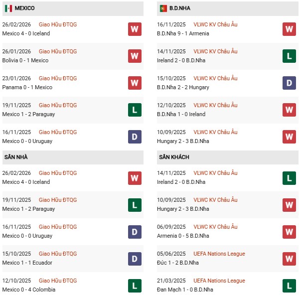 Thống kê phong độ Mexico vs Bồ Đào Nha: