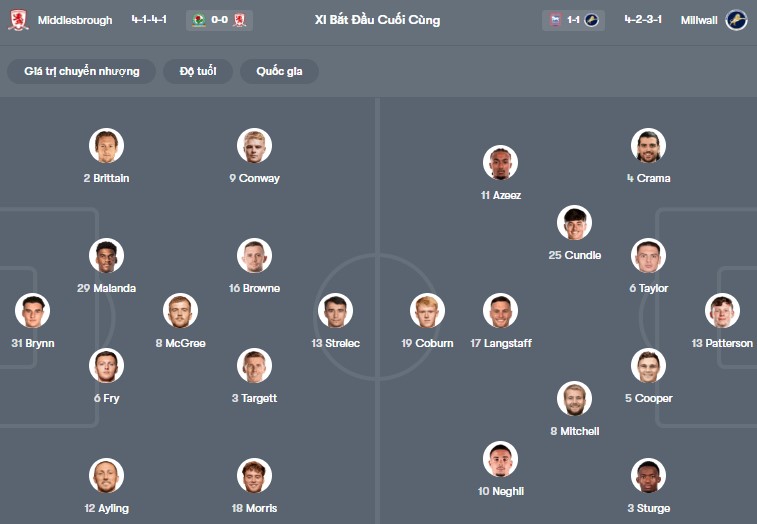 Đội hình dự kiến Middlesbrough vs Millwall: