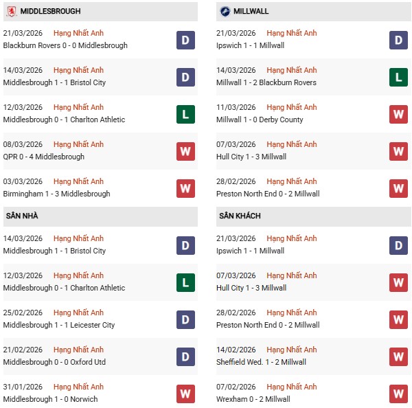 Thành tích sân khách của Millwall cũng rất ấn tượng với chuỗi 4 chiến thắng trong 5 chuyến hành quân gần đây. Tuy nhiên, việc phải làm khách trên sân của đối thủ cạnh tranh trực tiếp sẽ là thử thách rất lớn, đặc biệt khi Middlesbrough luôn chơi cực kỳ lì lợm tại Riverside.