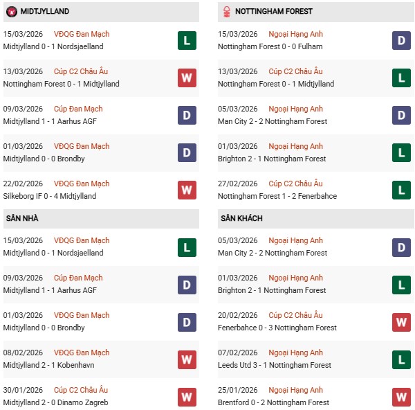 - Midtjylland toàn thắng cả 2 trận đối đầu Nottingham gần đây.