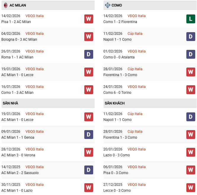 Tính riêng tại sân San Siro trên mọi đấu trường, Milan cũng chiếm ưu thế gần như tuyệt đối khi thắng 10, hòa 5 và chỉ thua 1 ở 16 trận đụng độ với Como. Hơn nữa, trên sân nhà, Milan chỉ thua 1/13 trận gần nhất, bao gồm chuỗi 11 trận bất bại vừa qua (8 thắng, 3 hòa).