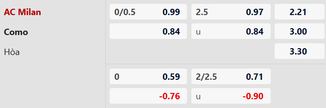 Lẻ bàn thắng: 5/7 cuộc đối đầu gần nhất, 9/12 trận sân nhà vừa qua của Milan và 4/6 chuyến làm khách gần đây của Como đều có tổng bàn thắng là lẻ. Trận này khó có ngoại lệ.