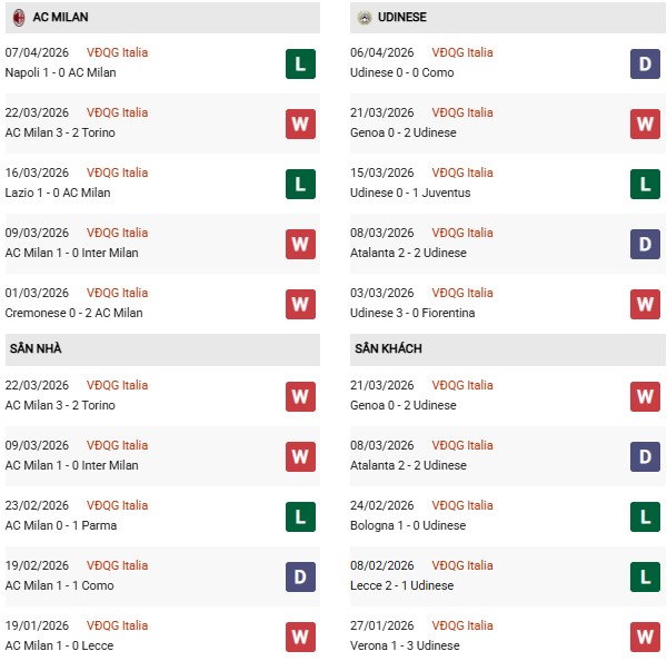 Thống kê phong độ Milan vs Udinese: