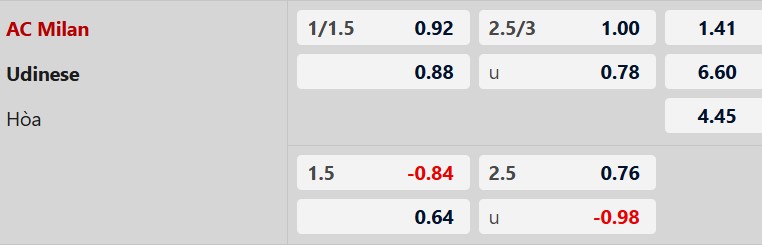 Nhận định kèo châu Á Milan vs Udinese: