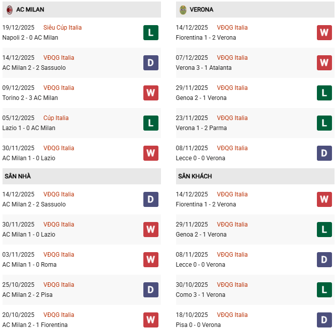 Thống kê phong độ Milan vs Verona: