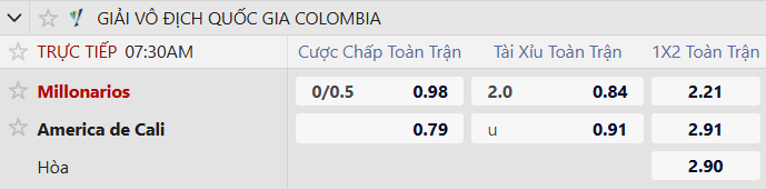 Thông tin tỷ lệ kèo Millonarios vs America Cali: