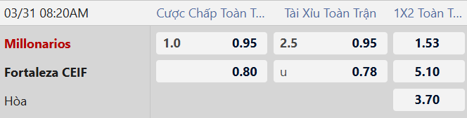 Thông tin tỷ lệ kèo Millonarios vs Fortaleza CEIF: