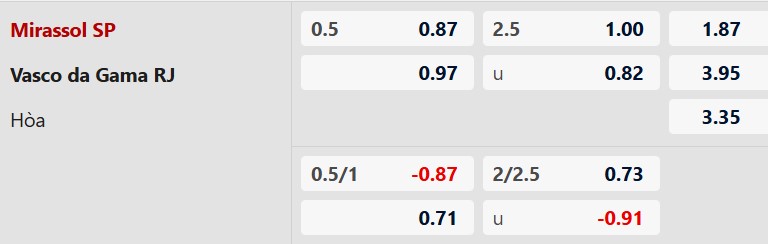 Thông tin tỷ lệ Mirassol vs Vasco da Gama: