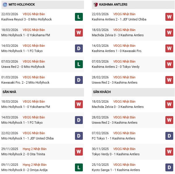 Thống kê phong độ Mito Hollyhock vs Kashima: