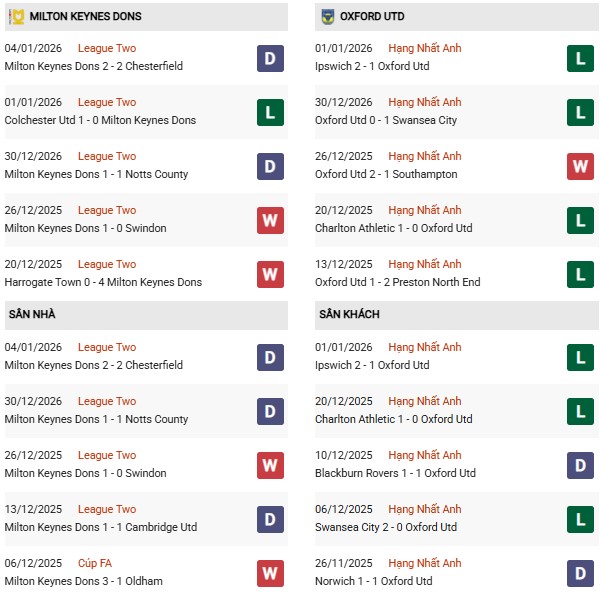 - Trên sân nhà, MK Dons thắng 2, thua 1 trước Oxford.