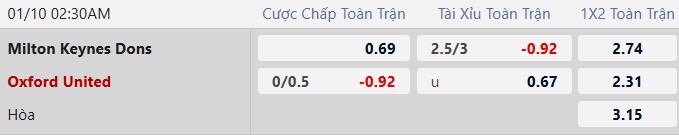 Thông tin tỷ lệ bóng đá MK Dons vs Oxford: