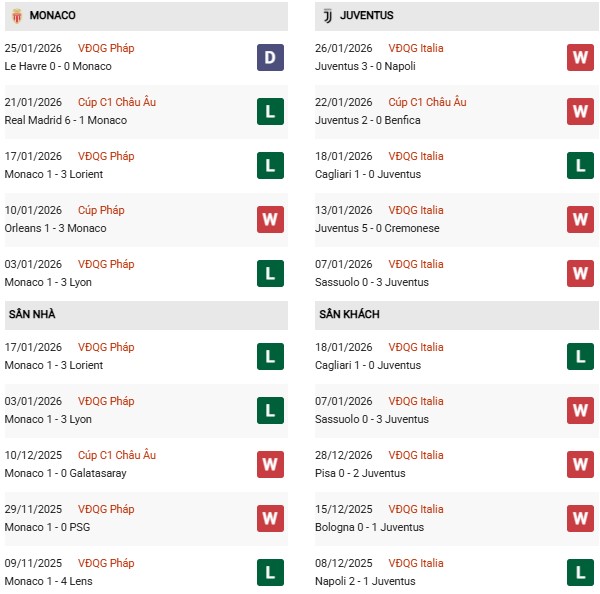 Thống kê phong độ Monaco vs Juventus: