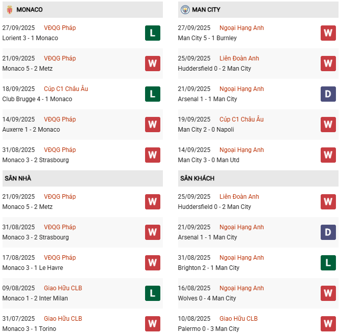 - Monaco thắng 1, thua 1 trong 2 trận gặp Man City gần đây.