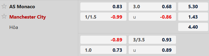 Thông tin tỷ lệ kèo bóng đá Monaco vs Man City: