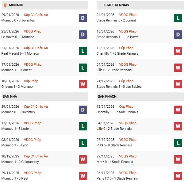 Thống kê phong độ Monaco vs Rennes: