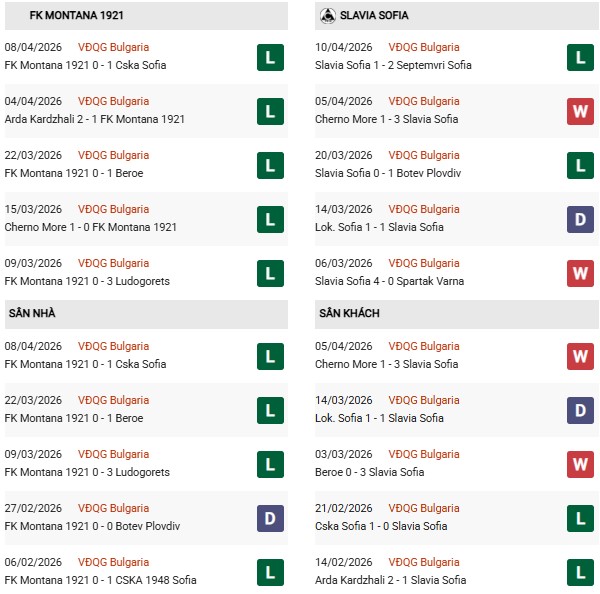 - Montana thắng 1, hòa 2, thua 7 trong 10 trận gặp Slavia Sofia gần đây.