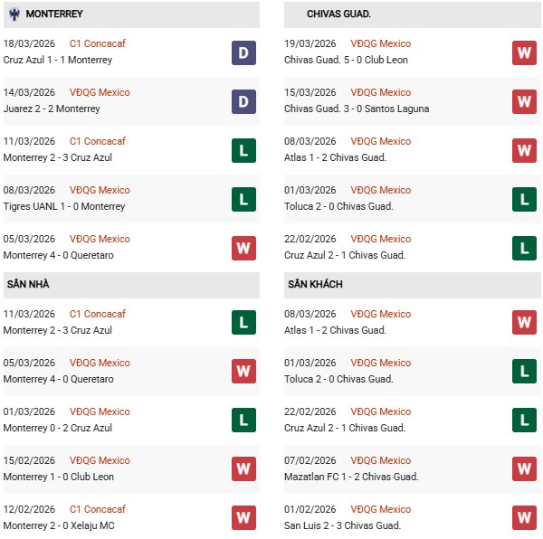 Vòng này, Monterrey tuy được chơi trên sân nhà nhưng lại phải đón tiếp một Guadalajara Chivas đang hay nhất chặng Clasura 2026: thắng 9/11 trận. Riêng 2 vòng mới nhất, đội bóng này chẳng những thắng tuyệt đối mà còn không thủng lưới lần nào và ghi được 8 bàn.