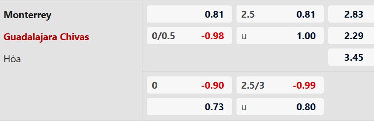 Thông tin tỷ lệ Monterrey vs Guadalajara: