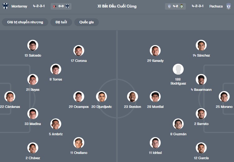 Monterrey: Medina, Rodriguez, Fimbres chấn thương.