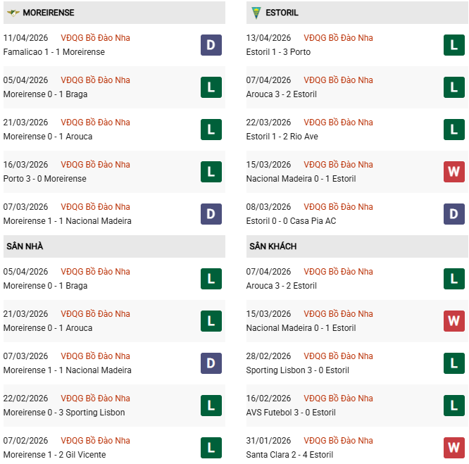 - Moreirense thắng 4, hòa 4, thua 2 trong 10 trận gặp Estoril gần đây.