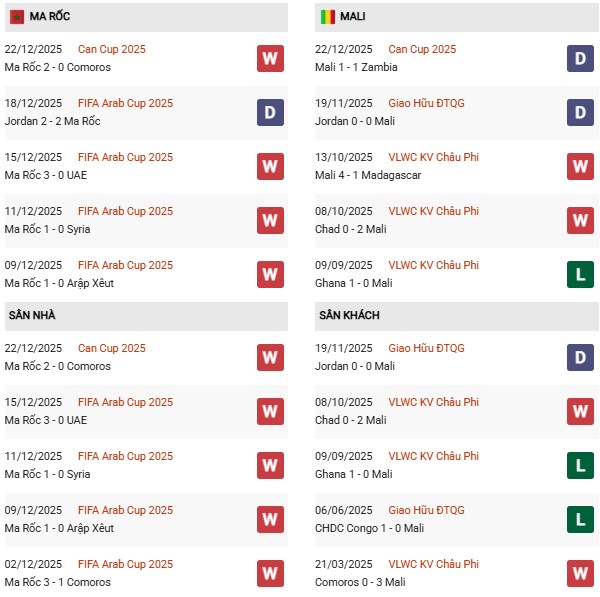 - Trên sân nhà, Morocco thắng cả 3 trận trước Mali.