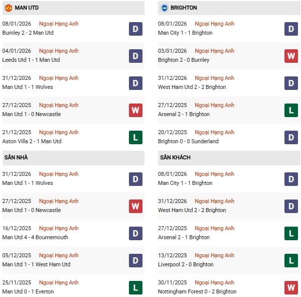 Thống kê phong độ MU vs Brighton: