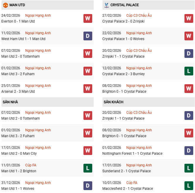Tối đa 2 bàn cả trận: 6/8 trận sân nhà gần đây của MU và 5/6 trận mới nhất của Crystal Palace chỉ có nhiều nhất 2 bàn thắng. 2 lần chạm trán vừa qua giữa hai đội ở Old Trafford xảy ra tình trạng tương tự.