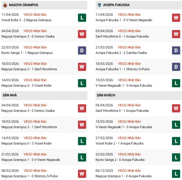 Thống kê phong độ Nagoya vs Avispa Fukuoka: