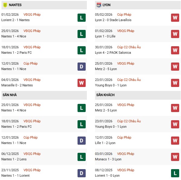 Thống kê phong độ Nantes vs Lyon: