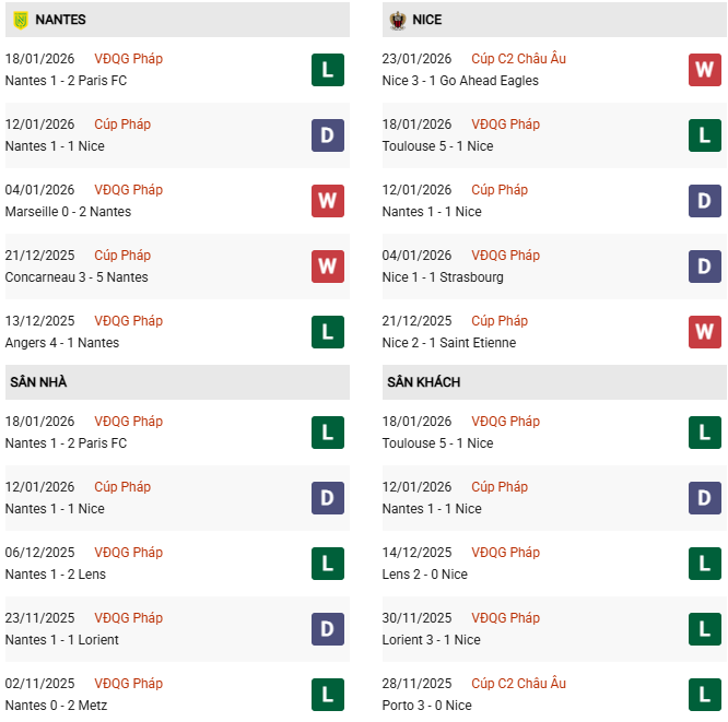 - Trên sân nhà, Nantes thắng 2, thua 4 trước Nice.