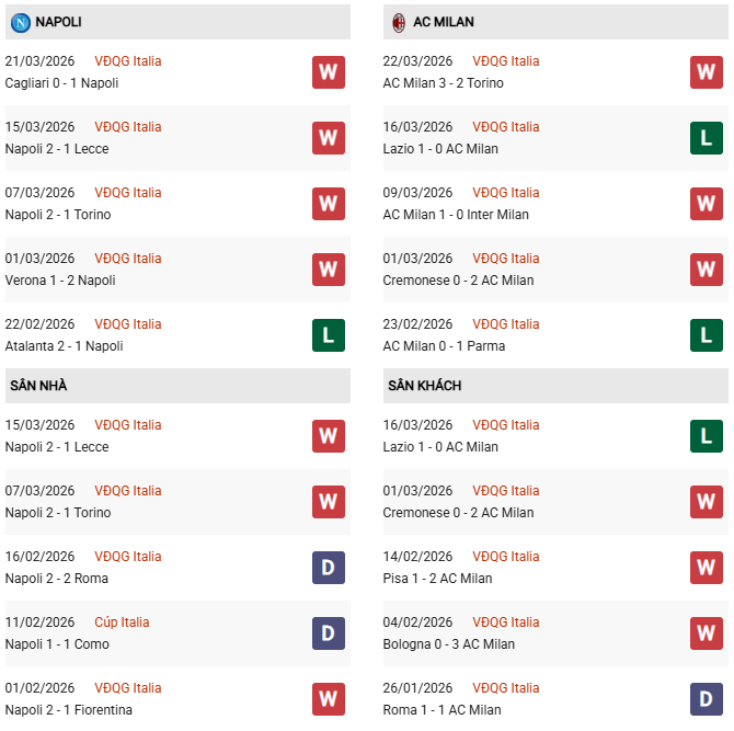 Thống kê phong độ Napoli vs AC Milan: